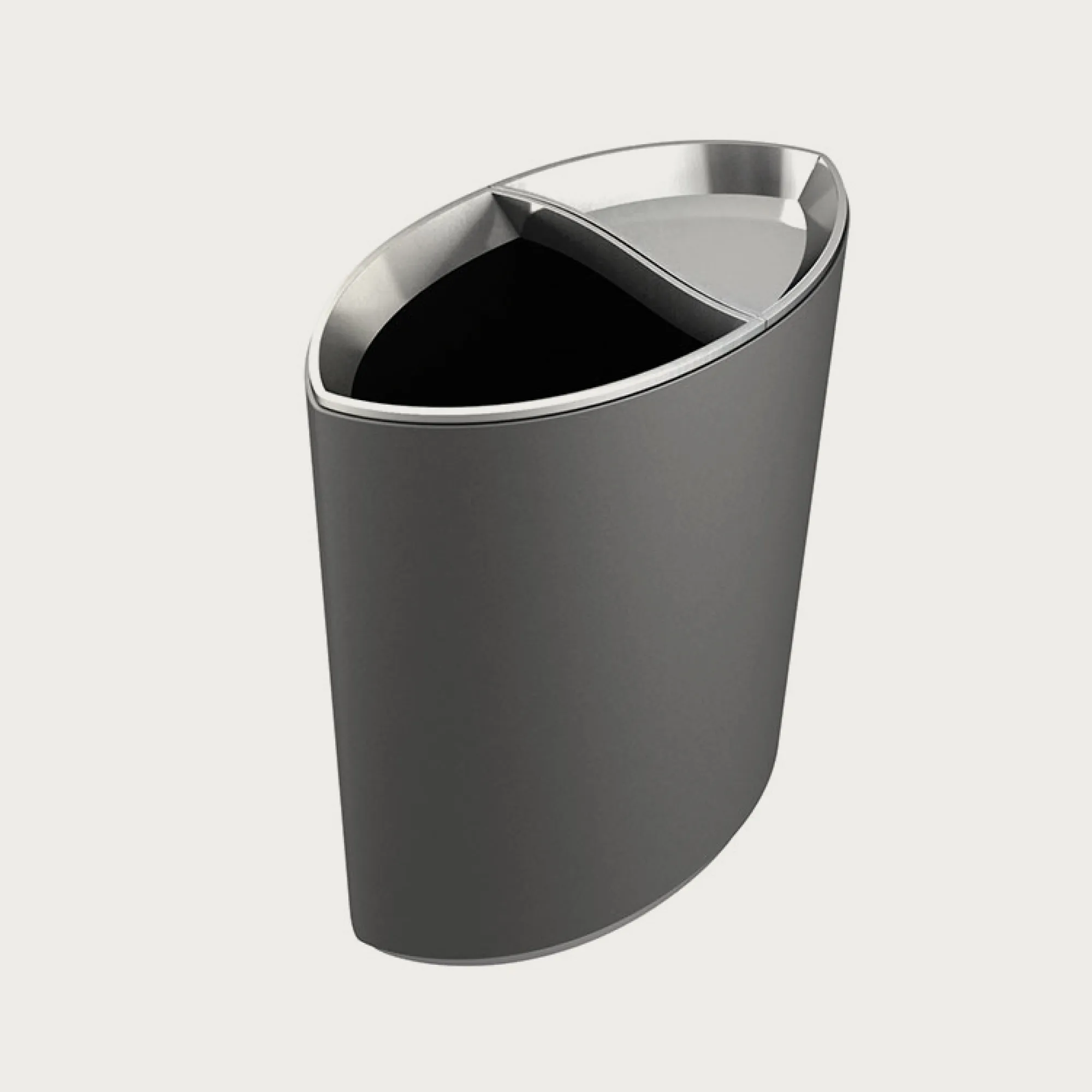 The top of the receptacle is made of 304T stainless steel with a directional satin finish, providing a sleek and modern look. The top is removable, allowing for easy access and maintenance. The receptacle also includes a kidney-shaped ash tray that is removable as well.